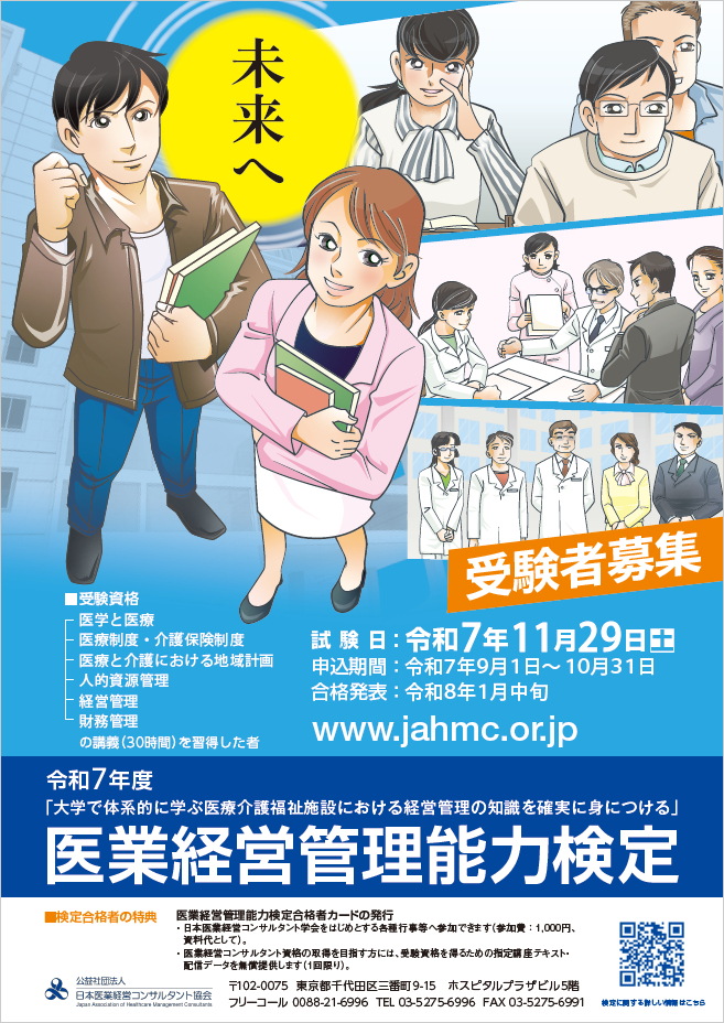 大学生等が、医療機関や医療関連企業等において飛躍の場を広げるために、医療介護福祉施設における経営管理の基礎知識を体系的に習得し、医療・保健・介護・福祉の健全な発展に寄与する、幅広い教養を身に付けた人材の育成を目的として、医業経営管理能力検定を実施しています。