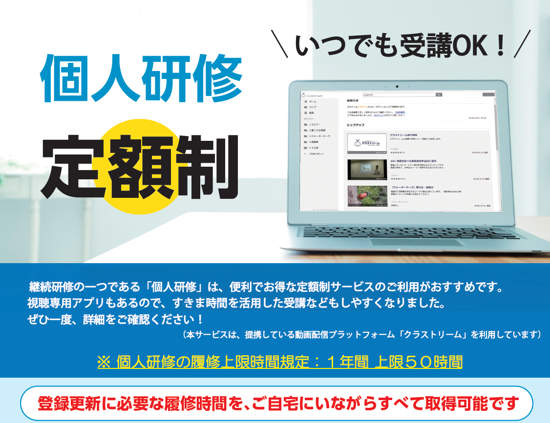 - 個人研修の履修認定は年間50時間が上限となり、これを超えて視聴された分はいかなる場合も履修対象とはなりません。
